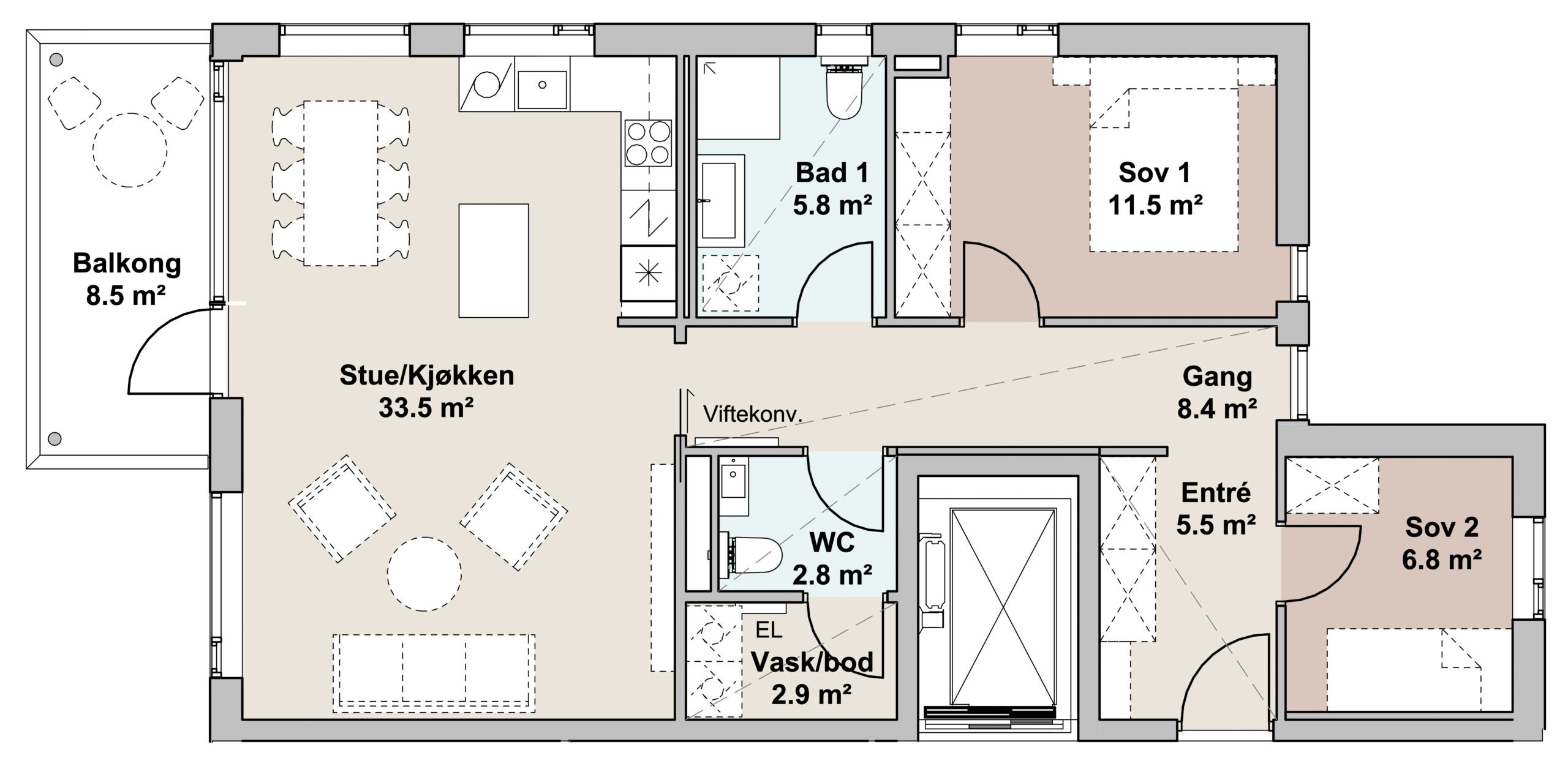 Entréen har god plass til garderobeskap og oppbevaring. Til høyre har du inngang til det minste av soverommene. Det første som møter deg i den lyse gangen videre inn i leiligheten, er hovedsoverommet. Deretter finner du bad, gjestetoalett og stort vaskerom/bod. Den romslige, stue/kjøkkenløsningen har store vinduer mot vest og mot nord. Dette gjør rommet veldig lyst og trivelig. Balkongen inviterer til å nyte ettermiddags- og kveldssola.