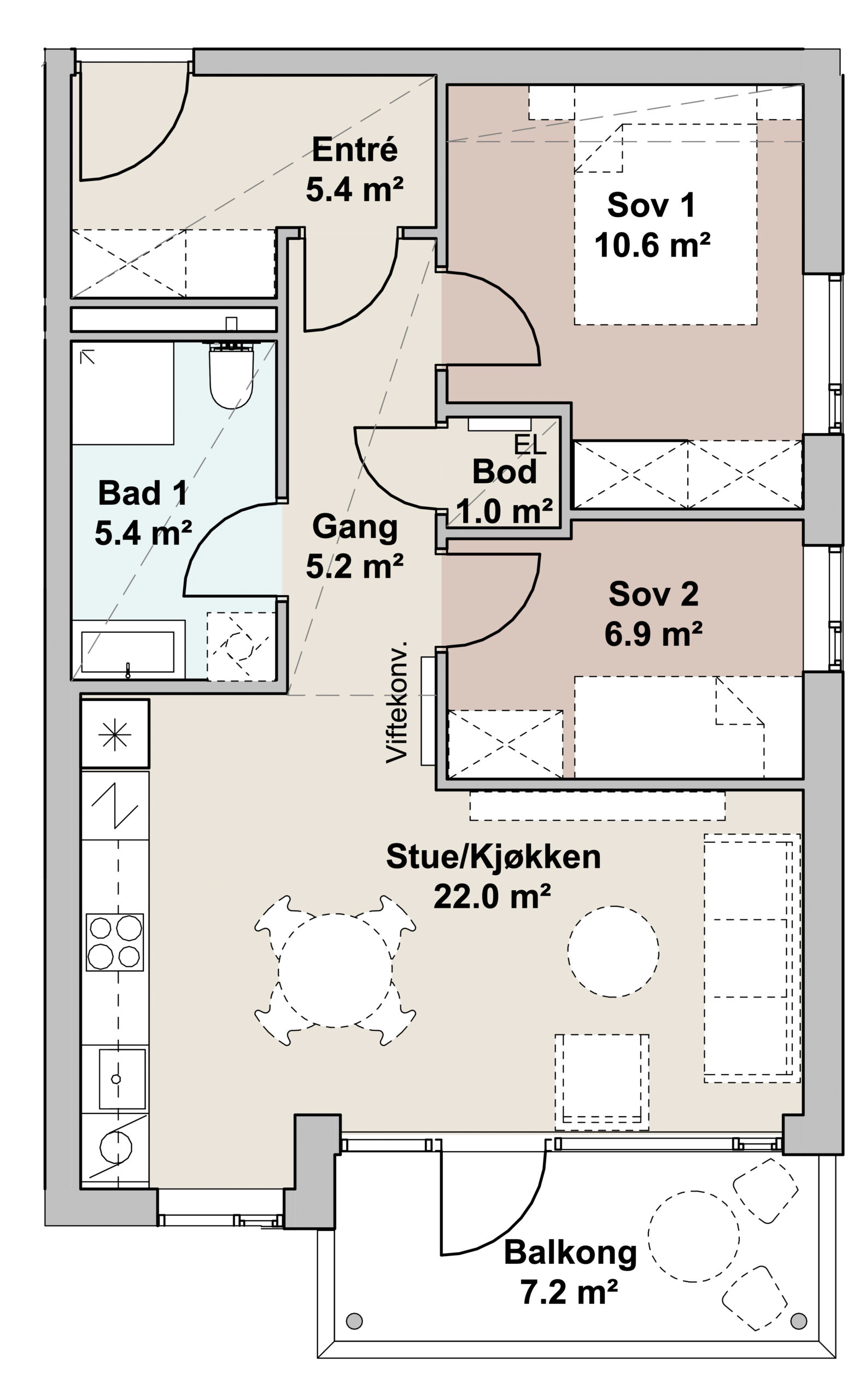 Den kompakte, men praktiske entréen har plass til skap og hyller. Hovedsoverommet har godt med rom for skap og oppbevaring, mens det mindre soverommet passer godt for en enkeltseng, køyseng eller sovesofa. Det lyse hovedoppholdsrommet med stue og kjøkken, har god arbeidsplass på kjøkkenet og plass til en trivelig hjørnesofa eller sittegruppe. Lyset kommer inn fra den store vindusåpningen mot sør. Og på fine dager inviterer balkongen til solfylte timer under åpen himmel.