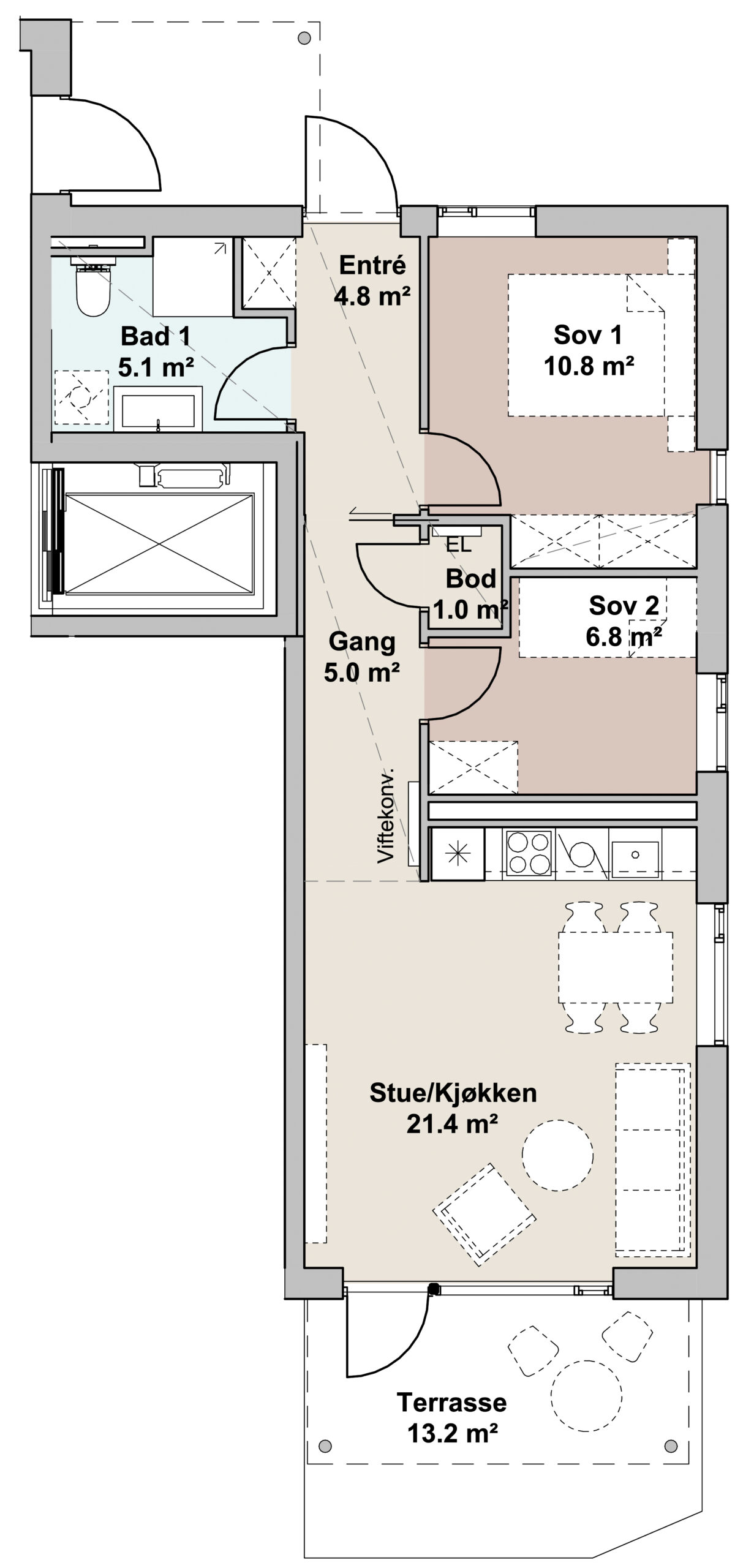 Den praktiske entréen ønsker velkommen og har god plass til å henge fra seg ytterklærne. Hovedsoverommet har lys fra to sider og godt med plass til skap. Badet er på nesten 6 m2 og er utstyrt med en smart nisje for vaskemaskin og tørketrommel. Den åpne stue/kjøkken-løsningen får morgensolen inn mot kjøkkenet, og store vinduer mot sør gir en lys og god atmosfære. Den delvis overbygde og sørvendte terrassen er på nesten 13 m2.