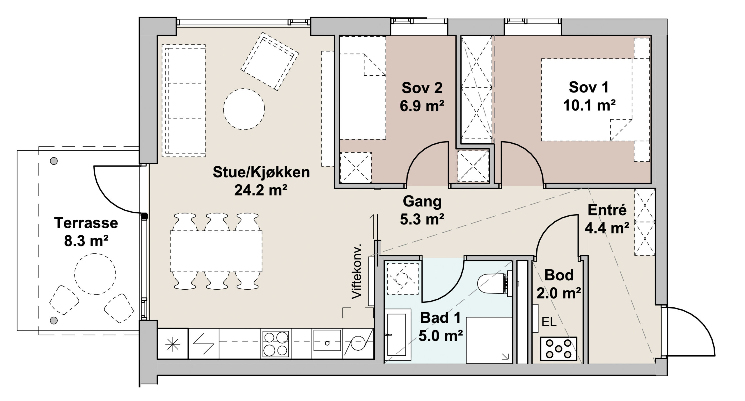 Her blir du ønsket velkommen av en praktisk entré med bod og garderobeplass. Videre inn møter du de to soverommene og badet. Stue/kjøkken vender mot vest og nord, og du får inn godt med lys fra to sider. Planløsningen gir rom for en god spiseplass og en hyggelig kosekrok som er skapt for en hjørnesofa eller en sittegruppe. Leiligheten har en koselig, delvis overbygd terrasse på drøye 8 m2.